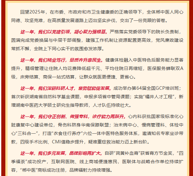 橘井迎春启新程 仁心笃行向未来——郴州市中医医院2026年新春贺词