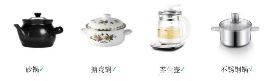 宜用:瓦罐、砂锅、瓷、养生壶、不锈钢锅。