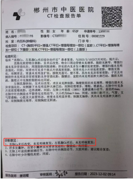 2023年12月初,连姐来到郴州市中医医院复查,报告单上显示:“直肠癌术后改变,未见明确复发;左乳腺癌术后,未见明确复发。”也宣告了这场坚持四年的双癌斗争结束,终于到了拨云见日的时候。连姐脸上也开始慢慢绽放出了笑容,又可以逐渐回归到一个正常社会人的生活了,体验普通而又丰富多彩的人生。